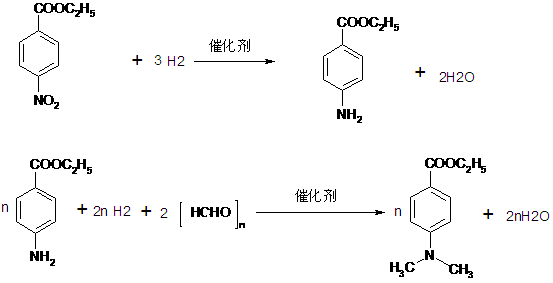 | 2 | 4m3二甲氨基苯甲酸乙酯(苯佐卡因)反應釜:采用自吸式攪拌機后,在其他工藝條件不變的情況下,后一步加氫時間由原來的16小時縮短到10小時左右,而且我們在生產過程中發(fā)現(xiàn)催化劑的使用了下降,每投一次催化使用時間比原來使用要長,統(tǒng)計后平均每釜料大約能節(jié)約30%的催化劑用量。 反應釜規(guī)格:3m3(ZX-3) 50°C 操作壓力:0.7MPa 主反應方程式: ![]() |