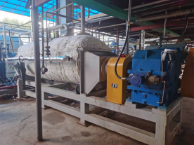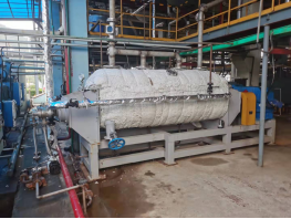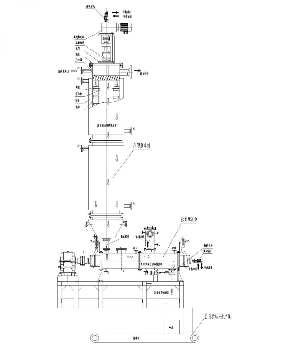 方案1:利用索孚專利產(chǎn)品臥式單自清潔薄膜蒸發(fā)器和臥式雙軸自清潔干燥機(jī)在高溫330C°以下和真空-0.095MPa左右條件下,回收大部分有用高沸物溶劑產(chǎn)品,最終殘留量≤0.2%,再將釜殘廢鹽等直接干燥固化破碎處理;(物料特性:溶劑脫除完畢直接固相析出和通過高溫催化裂解成固相物料,例如:廢鹽釜殘,苯二酚釜殘,甲基丙烯酸釜殘,二甲基-咪唑啉酮釜殘,亞硫酸氫鉀鹽干燥,二甲基亞砜(DMSO)釜殘?zhí)幚?,染料中間體廢活性炭干燥處理,污泥等等)